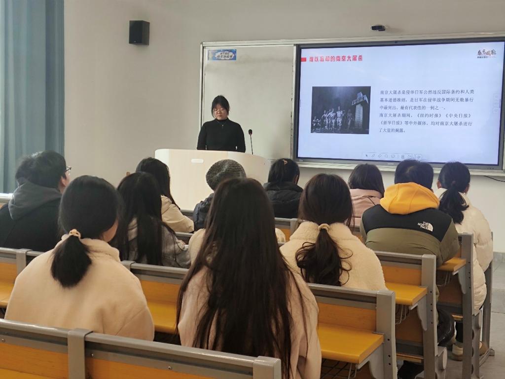 活动伊始,全体肃穆默哀一分钟,沉痛悼念南京大屠杀中三十多万遇难同胞,凝重氛围弥漫全场。团课借助精心制作的 PPT 与震撼视频,生动呈现南京大屠杀惨状,侵华日军暴行触目惊心,使同学们深刻领悟战争残酷与和平珍贵。